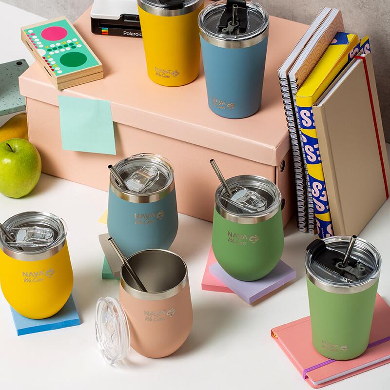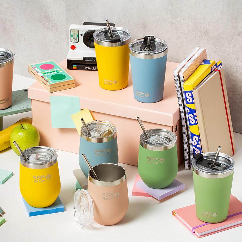 Paharul termos Nava 360ml „We Care” cu pai din oțel inoxidabil, într-o culoare superbă, este un produs inovator care îmbină funcționalitatea cu stilul.