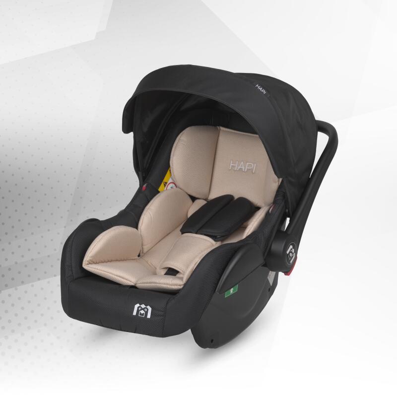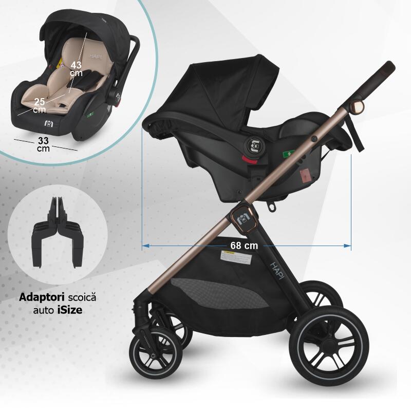 Sistemul Hapi Soley 3 în 1 include și o scoică auto i-Size, potrivită de la naștere până la 13 kg, cu protecție laterală avansată și tetieră reglabilă. Scoica se montează ușor pe cadru, cu ajutorul adaptorilor incluși, transformând căruciorul într-un sistem complet de călătorie.