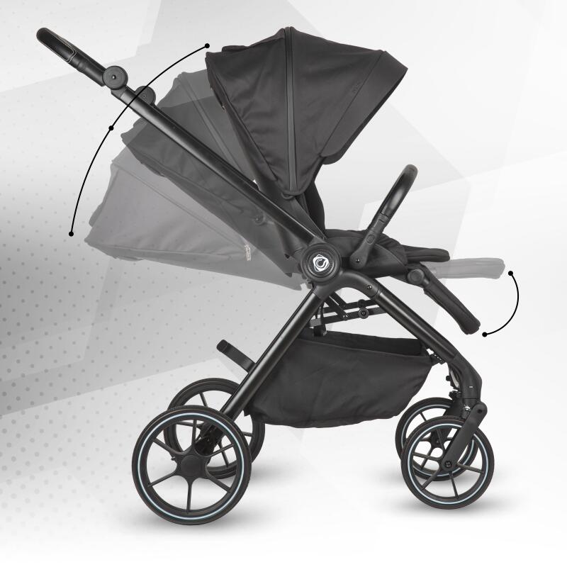 • Look coerent (cărucior + scoică + bază), cu detalii premium (mâner/bară eco-piele, accente, finisaje).
