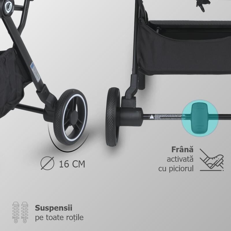 Melia nu este doar practică — este și un cărucior cu aspect premium: cadru negru elegant, detalii plăcute la atingere pe mâner și bară, finisaje atent realizate și un coș spațios pentru tot ce ai nevoie în oraș (sau în parc).