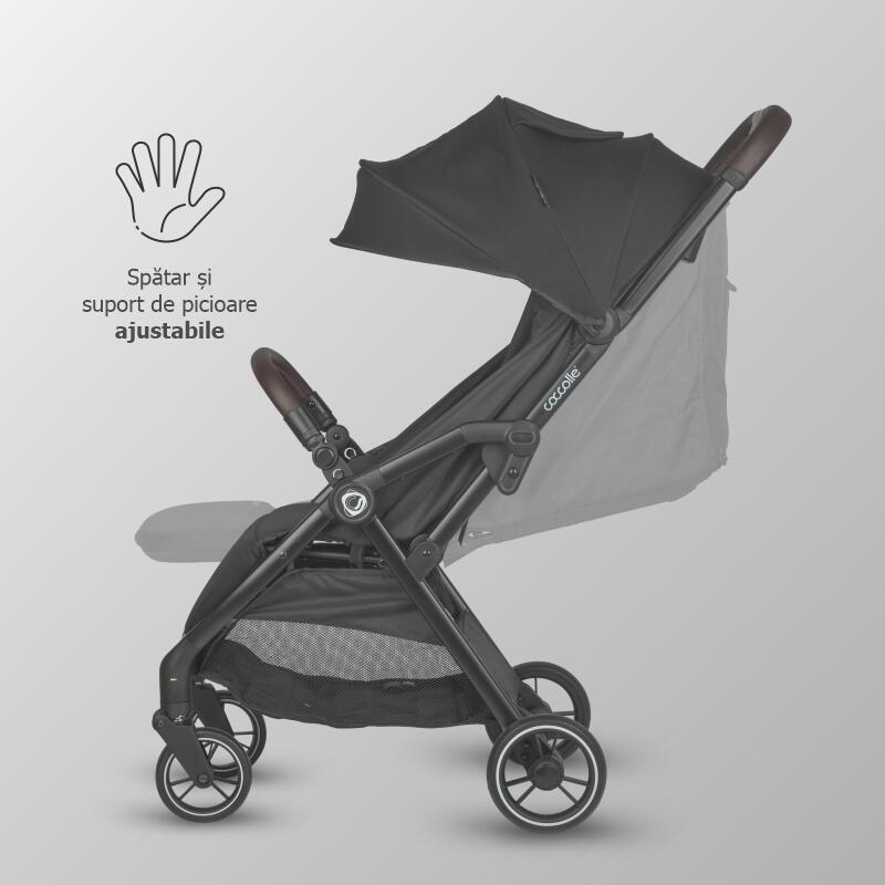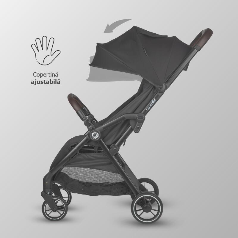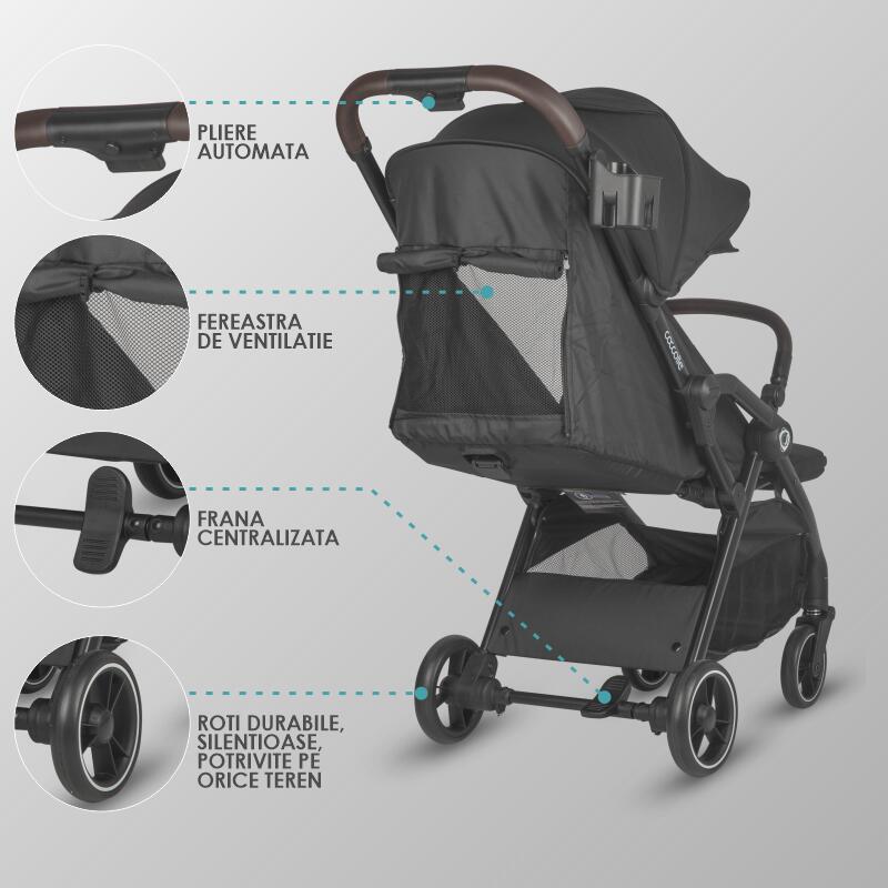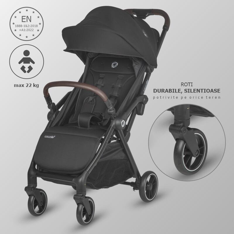 Carucior sport cu pliere compacta automata Coccolle Arella, Cadru aluminiu, Roti detasabile, Spatar reglabil, Protectie UV, Copertina extensibila, Ventilatie, Sarcina maxima 22 kg, Jet Black