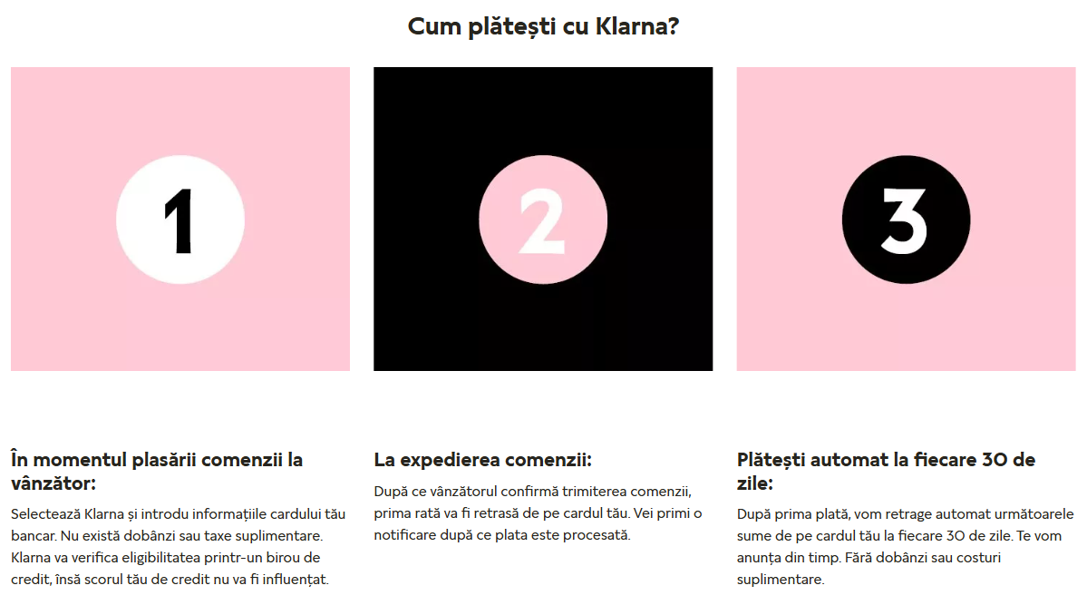 Prin Klarna ai opțiunea de a cumpăra acum și de a plăti achiziția mai târziu. Împarte costul achiziției în 3 rate fără dobândă, ca să îl poți acoperi în timp. Prima rată este debitată la procesarea comenzii, iar celelalte 2 sunt debitate automat la fiecare 30 de zile de pe cardul de debit sau de credit pe care îl alegi. Află mai multe aici.