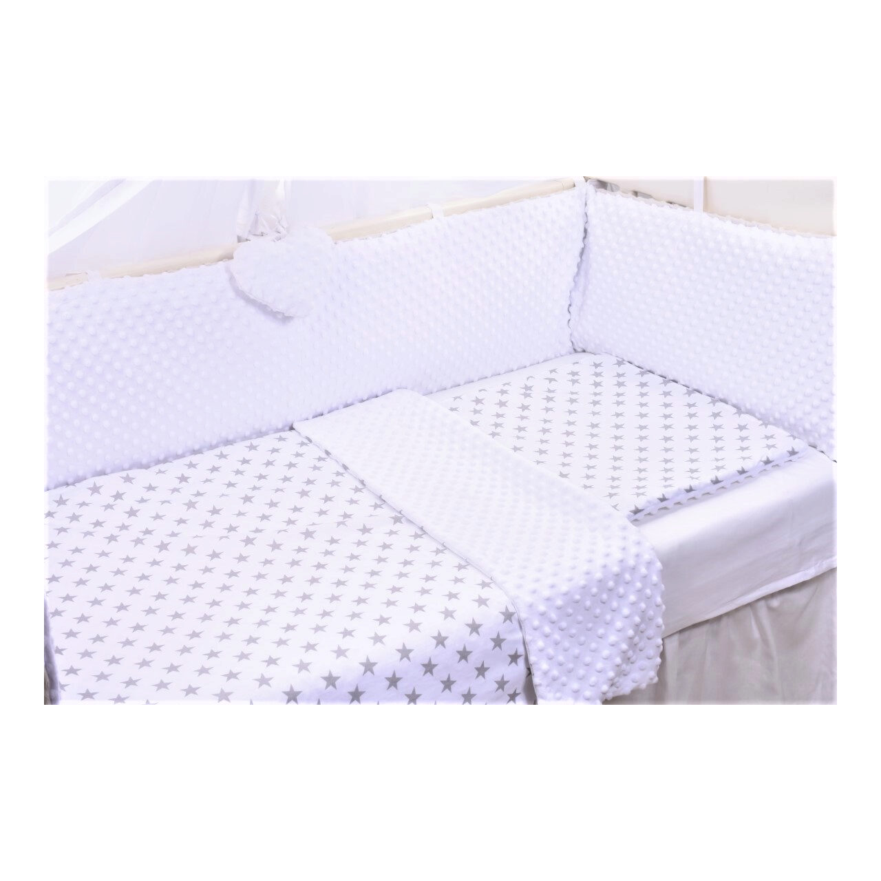Lenjeria model stelute gri este realizata din bumbac premium de inalta calitate, certificat OEKO TEX, perfect sigur pentru copilasi inca din prima zi. Am combinat setul cu minky pufos de culoare alba, culoarea veseliei si a gingasiei copiilor. Plusul folosit este gros si dens, ideal pentru a oferi caldura si stare de bine. Lenjeria contine o paturica moale, confortabila si usoara cu dimensiunea de 75x100 cm. Alaturi de paturica se afla in set si o pernuta plata, foarte subtire,cu dimensiunea de 40x50 cm, ce nu modifica pozitia corpului bebelusului in timpul somnului, protejand si ajutand la pastrarea cearsafului si implicit a saltelutei curate. A treia piesa din set este cearsaful. In culoarea alba uni, cearsaful este din bumbac 100% moale si foarte placut la atingere. Are capete elastice, fixandu-se cu usurinta de salteluta. Toate aceste 3 piese fac setul sa fie unul usor, versatil si foarte practic. Spre deosebire de seturile de lenjerie clasica, din acest set poti folosi paturica in landou, carucior sau masina, iar pernuta plata poate fi utilizata cu succes ca suport pentru salteluta de infasat ori in bagajul bebelusului atunci cand mergeti in vizita. Lenjeria model Stelute gri inspira prin simplitate, eleganta si bun gust, fiind o alegere excelenta pentru cadoul de babyshower al unei viitoare mamici sau cu ocazia unui botez. Compozitie: bumbac 100% certificat OEKO-TEX si minky pufos, vatelina siliconizata 1 cm grosime Instructiuni: se recomanda spalarea la 30 grade C , 800 rotatii cu detergent band, adaptat culorilor si uscare naturala.Calca DOAR partile din bumbac, superficial, fara a insista ( vei aplatiza bulinutele de pe spate).