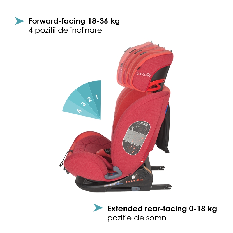 Scaunul auto are 3 pozitii de inclinare in pozitia rear-facing si 4 pozitii de inclinare pentru forward-facing; confera posibilitatea de instalare atat prin sistemul isofix, dar si prin centura in 3 puncte a autoturismului.