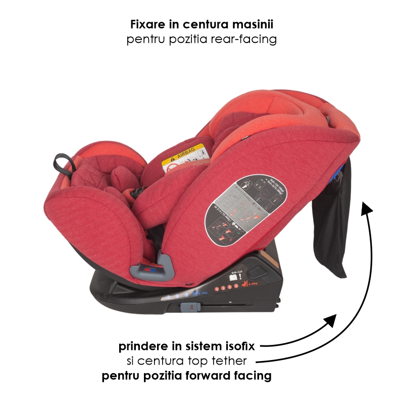 - Posibilitate de instalare atat prin sistemul isofix + top tether, cat si prin centura in 3 puncte a masinii