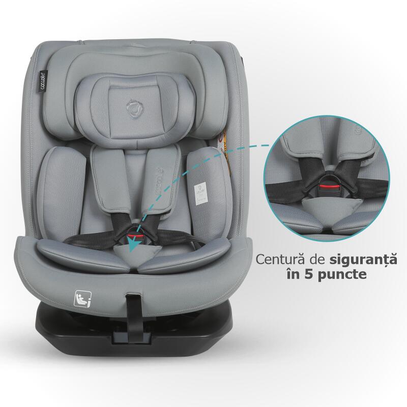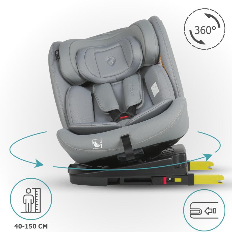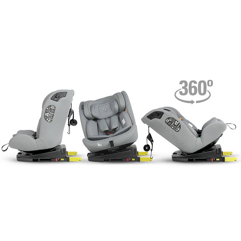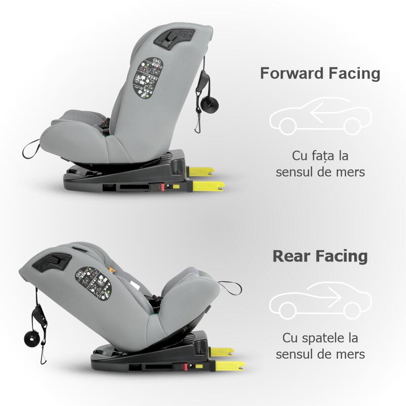 Funcția de rotație completă face ca poziționarea copilului în scaun să fie extrem de ușoară, iar trecerea de la modul rear-facing (cu spatele la sensul de mers) la forward-facing se face rapid și fără efort.