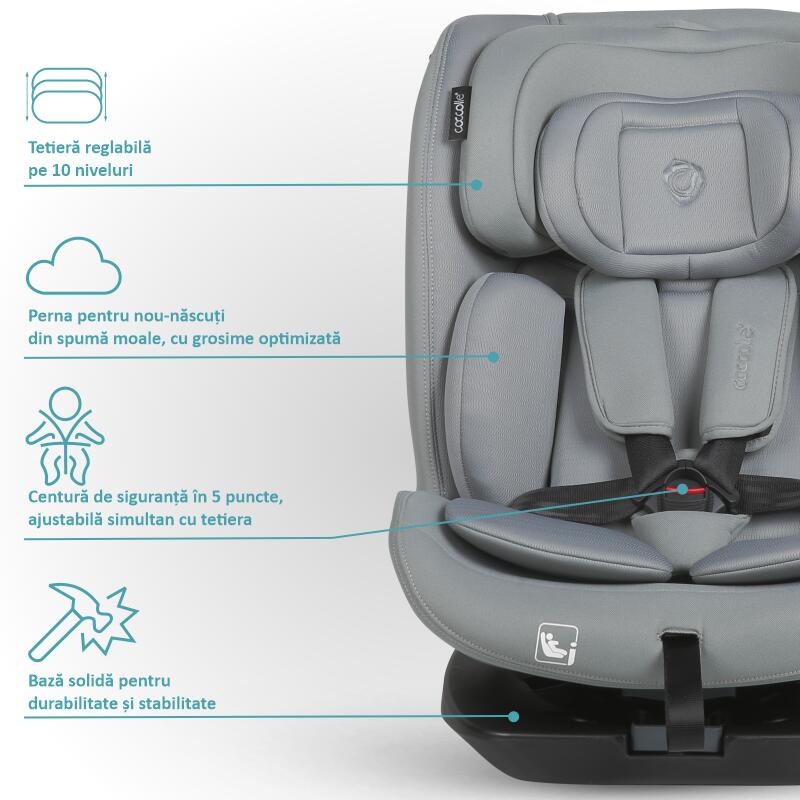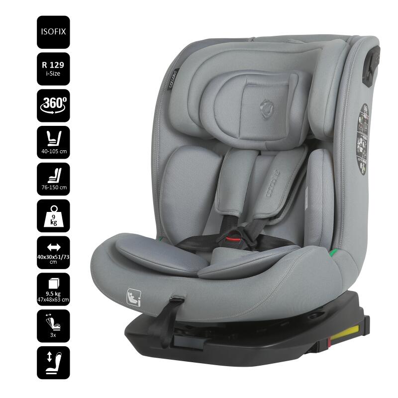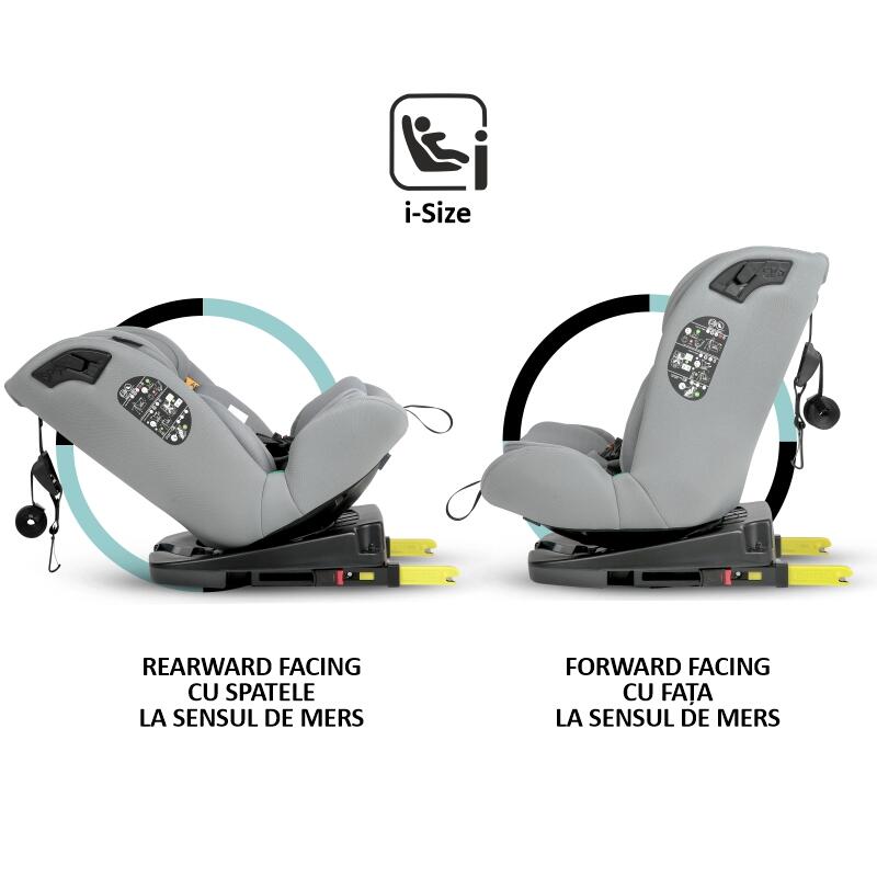 - Potrivit de la naștere până la înălțimea 150cm (grupa 0/1/2/3), conform standardului i-Size