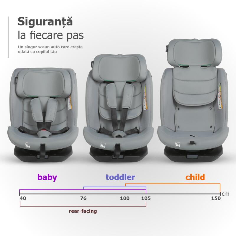 Siguranță, confort și adaptabilitate pentru toate etapele de creștere – între 40 și 150cm (aproximativ 0–12 ani)