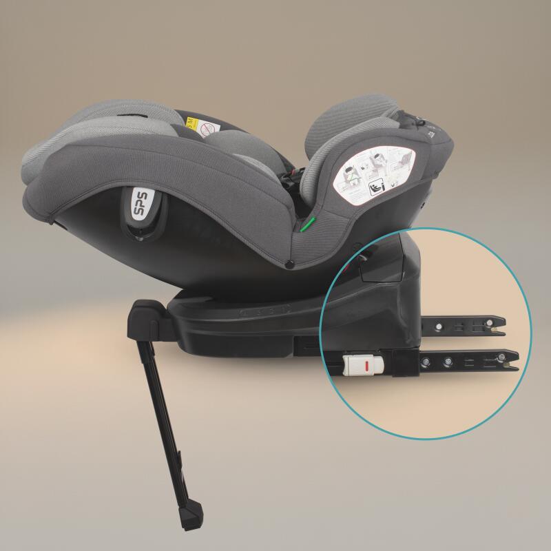Instalarea scaunului auto se face prin isofix si picior de sustinere, un mod de instalare comod si practic, potrivit majoritatii autoturismelor de pe piata. Sistemul de rotire 360 de grade se poate utiliza cu o singura mana, facilitand astfel plasarea si scoaterea copilului din scaunul auto. Scaunul auto are 11 pozitii de ajustare a tetierei si 4 pozitii de ajustare pe spate, dupa reglarea centurilor si a tetierei pentru inaltimea de 105 cm.