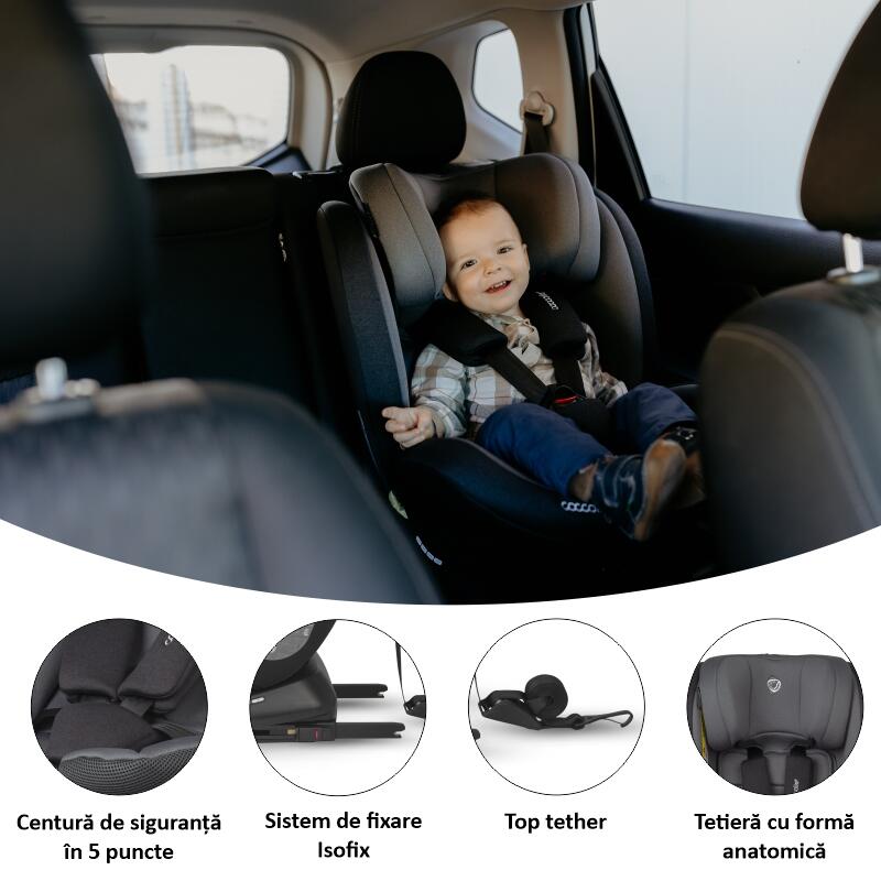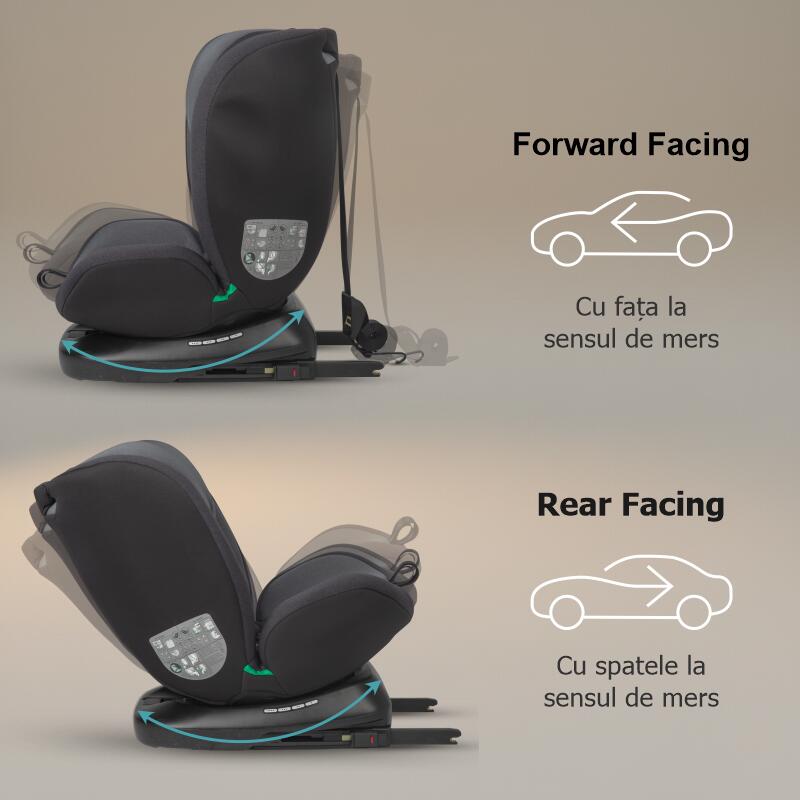 - Ajustabilitate maxima si confort: 1 pozitie rear-facing, 4 pozitii forward-facing, 7 pozitii la tetiera, centura de siguranta ajustabila