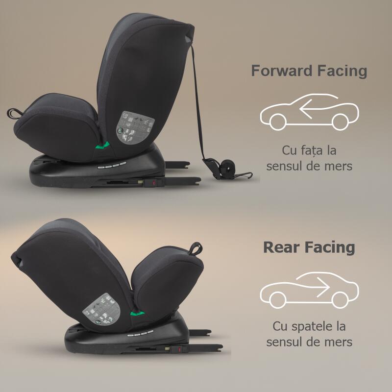 • Ajustabilitate maxima si confort: 1 pozitie rear-facing, 4 pozitii forward-facing, 7 pozitii la tetiera, centura de siguranta ajustabila