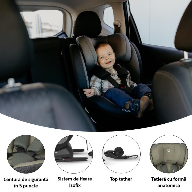 - Ajustabilitate maxima si confort: 1 pozitie rear-facing, 4 pozitii forward-facing, 7 pozitii la tetiera, centura de siguranta ajustabila