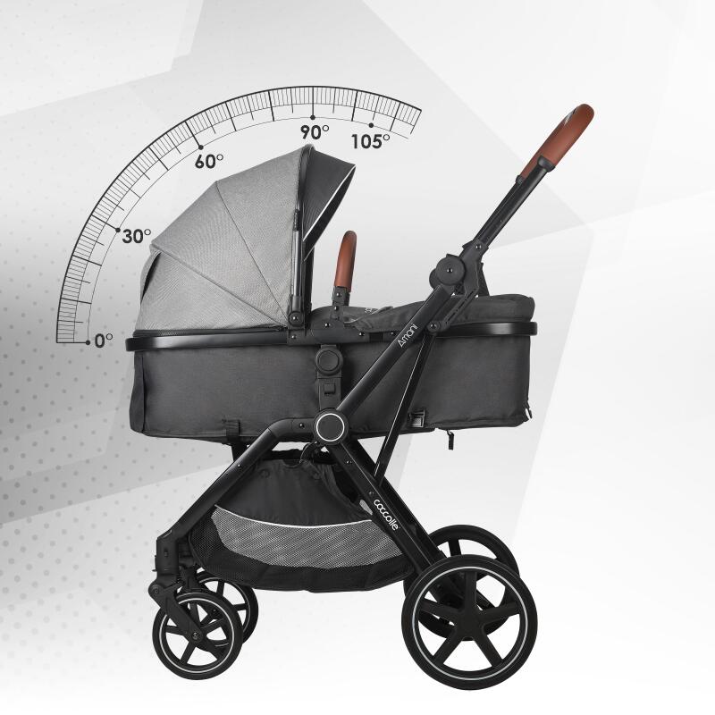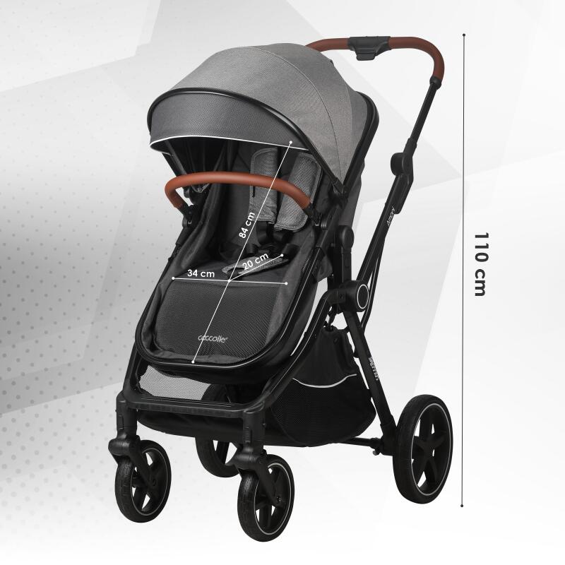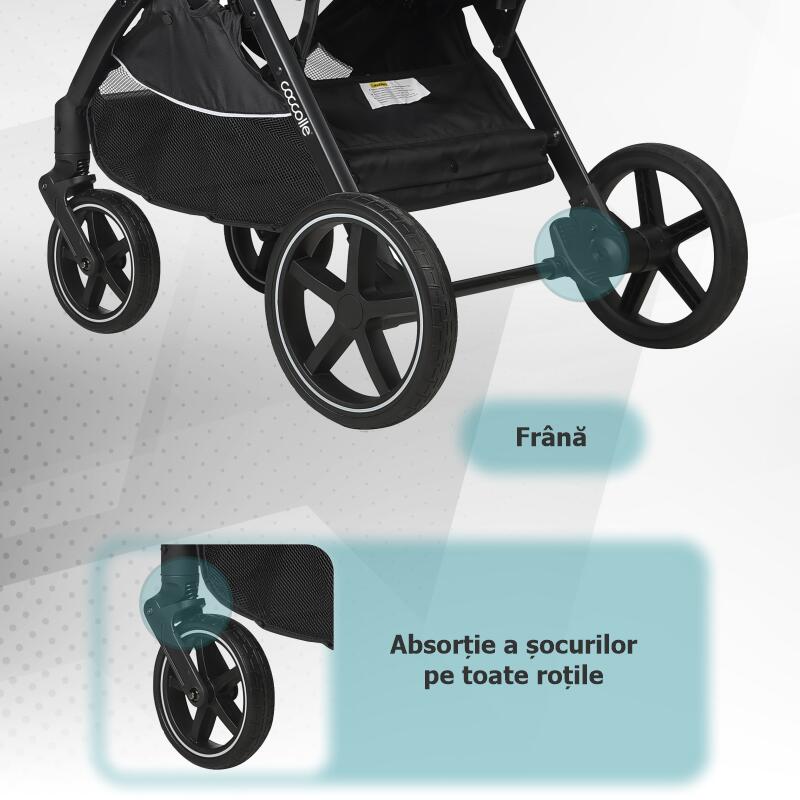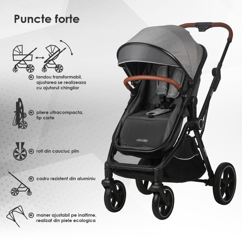 Materialele de calitate din care este fabricat caruciorul sporesc experienta placuta intrucat componentele textile sunt moi si placute la atingere, dar rezistente la praf si utilizare indelungata, in timp ce componentele metalice sunt realizate din aluminiu, un element usor, dar in acelasi timp rezistent. Micile accente de piele ecologica confera produsului o eleganta aparte, iar multumita cosului de cumparaturi generos va asigurati ca nu lipseste nimic din arsenalul necesar fiecarei plimbari cu un pui de om.