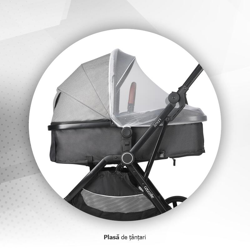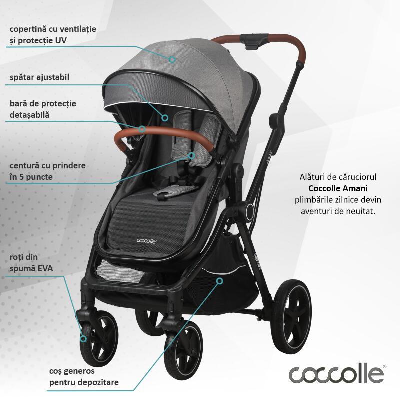 Chiar daca pare un produs simplu, Coccolle Amani este un sistem modular complex bine echipat pentru toate anotimpurile si pentru toate timpurile de iesiri. Ca accesorii, setul cuprinde husa de picioare calduroasa care il apara pe cel mic de intemperiile din toamna si iarna, husa impotriva insectelor este perfecta vara cand fiecare iesire poate provoca intepaturi neplacute, iar husa de ploaie protejeaza copilul atunci cand vremea devine capricioasa. Copertina XXL acopera perfect copilul, prevenind efectul nociv al radiatiilor solare, iar fereastra de ventilatie este perfecta pentru prevenirea supra-incalzirii. Scoica auto din dotare se potriveste atat pe cadru (cu ajutorul adaptorilor inclusi) cat si in masina, fiind perfecta atunci cand aveti de realizat comisioane rapide ce nu dureaza ore in sir.