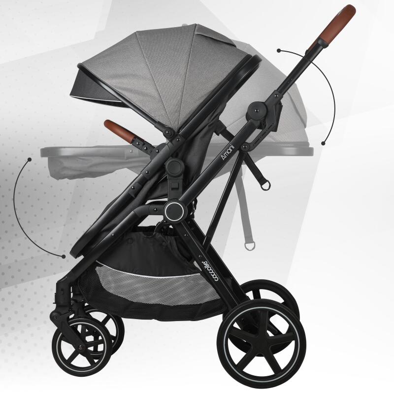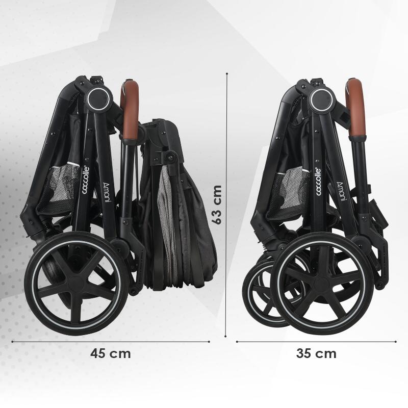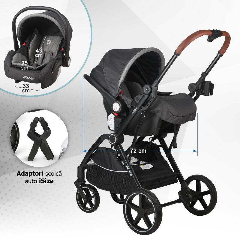 Carucior transformabil 3in1 Coccolle Amani iSize, Cadru aluminiu, Roti mari din cauciuc plin, Suspensie, Husa de picioruse, Husa Ploaie, Plasa insecte, Copertina XXL, Pliere compacta, Anthracite