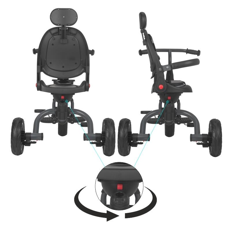 Pe masura ce copilul creste, accesoriile tricicletei se indeparteaza si produsul poate fi utilizat ca o tricicleta clasica. Dotata cu roti din cauciuc, tricicleta asigura plimbari flexibile si line.