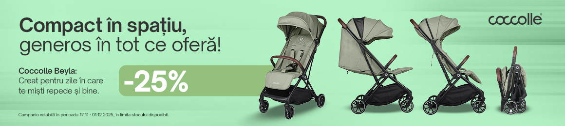 - Copertină detașabilă și pliabilă: Protejează copilul de razele soarelui și poate fi ajustată sau îndepărtată în funcție de condițiile meteorologice.